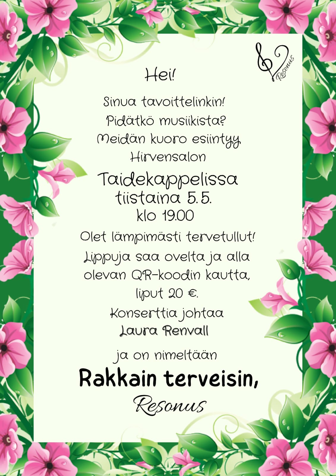 Lämminhenkisessä joulukonsertissa kuullaan vanhoja ja uusia joululauluja naiskuorolle sovitettuina versioina, jotka tuovat taatusti joulun kaikenlaisten musiikin ystävien sydämiin. Valmistaudu siis hyvin: pukeudu jouluisimpaan asuusi, juo glögit jo etukäteen ja saavu Naantalin tunnelmalliseen keskiajan kirkkoon klo 18 sunnuntaina 7.12., ja annan joulun tulla luoksesi. Naiskuoro Resonus toivottaa teidät lämpimästi tervetulleeksi kuuntelemaan ja nauttimaan joulun rauhasta!